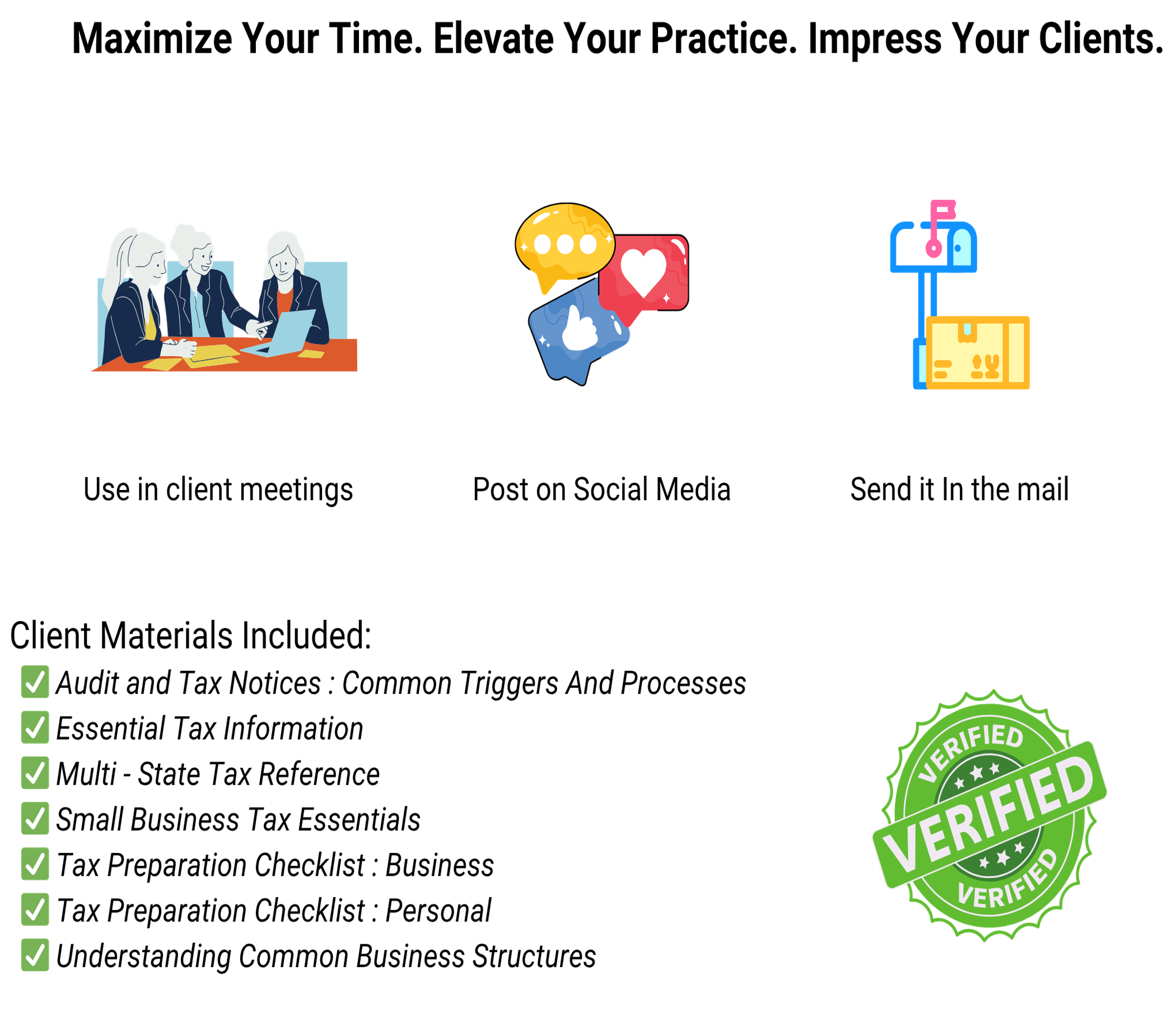 This bundle delivers the complete annual digital toolkit plus 50 high-quality printed copies of each template, giving you a ready-to-deploy system for tax season, client meetings, audits, and ongoing advisory conversations.